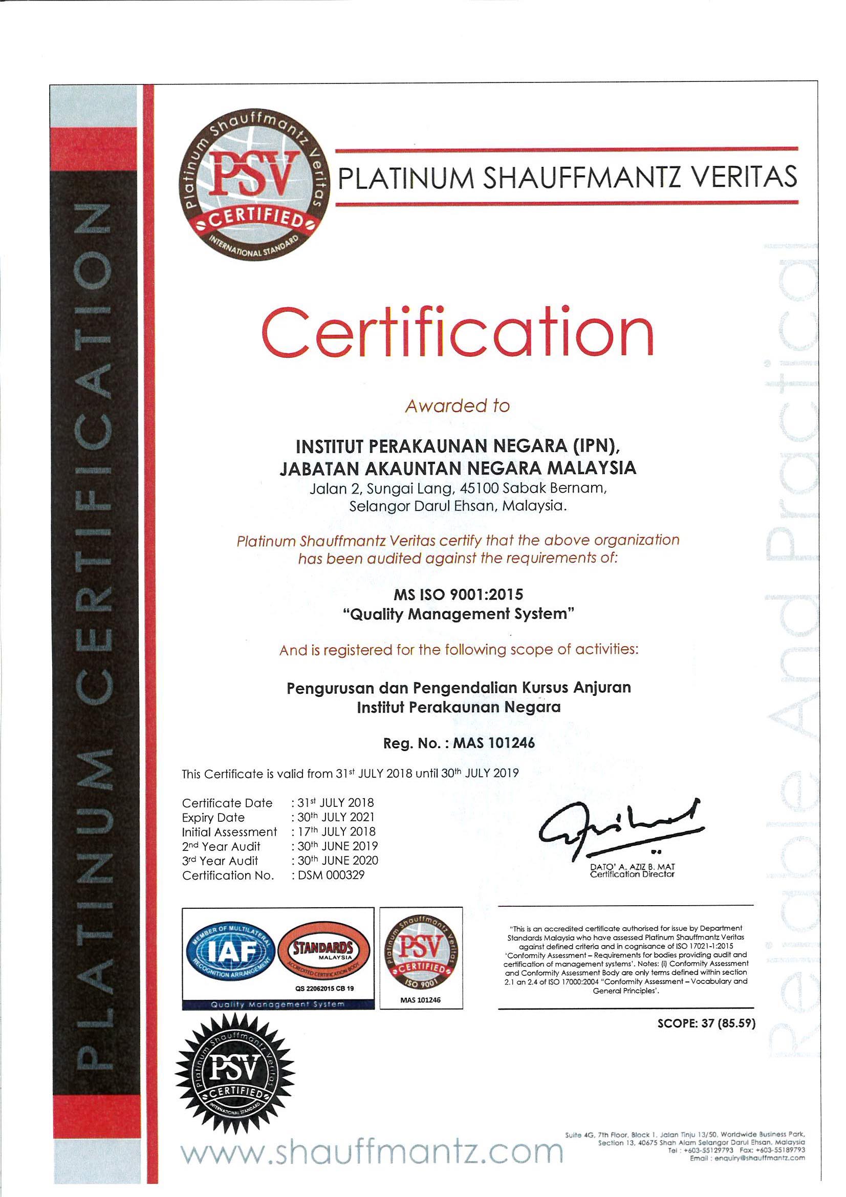 MS ISO 9001:2015 Scope of Activities : Pengurusan dan Pengendalian Kursus Anjuran Institut Perakaunan Negara Reg. No. : MAS 101246